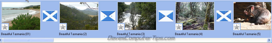 Unfortunately there is no ‘Randomize’ option available so if you wish to use random transitions you have to insert them individually, one at a time. That is okay in a small project but once you get up to 100+ photos or more it can be a right pain. The project I am using for this guide includes only 22 photos so I dragged and dropped different transitions randomly into the Storyboard. For a larger project it is best to select and use just one transition effect which will then be inserted automatically into all the spaces; once you have selected the transition and duly highlighted it, click on ‘Clip’ in the menu bar and select ‘Add to storyboard’. All the small squares should now be filled with transitions and your Storyboard should look something like this: