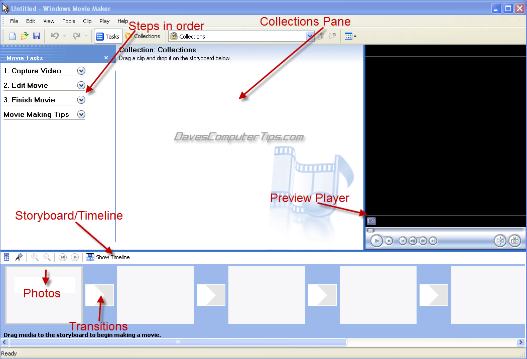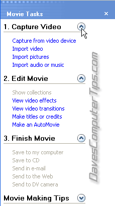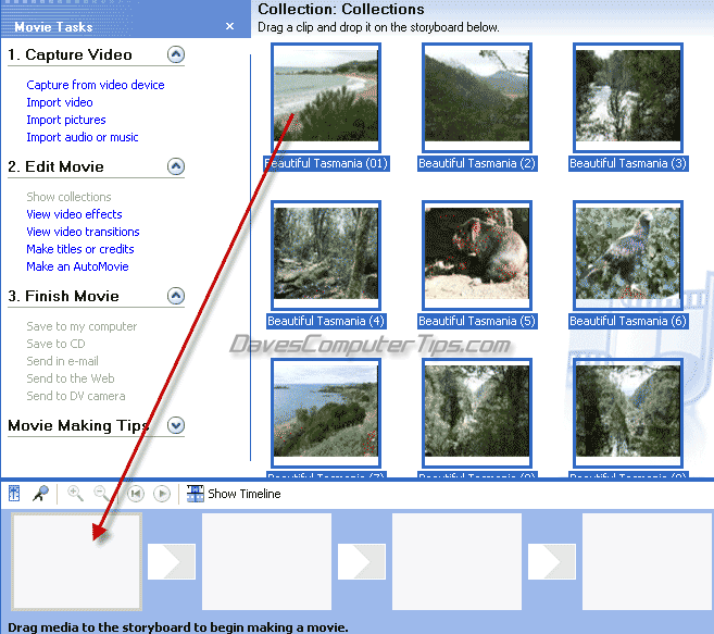 I shall be using the XP version of Windows Movie Maker. There are a few minor GUI changes in Vista/Windows 7 as well as an extra final option to burn to DVD using the native ‘Windows DVD Maker’.