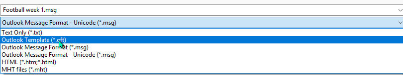 When finished with the email, choose File > Save As. In the “file type” ensure Outlook Template (*.oft) is selected.