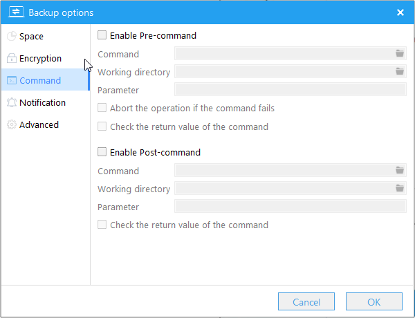 Hasleo allows setting a Pre-command and a Post-command for a task. The command may be a program or a script. Note that when in the WinPE recovery environment, this feature may not work because the drive letter assigned to the partition might be different.