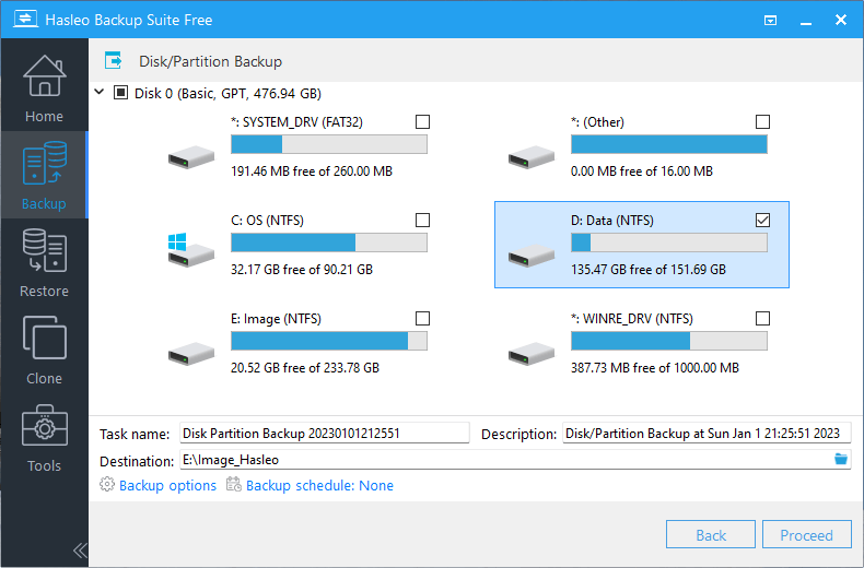 System Backup allows the backing up of the Windows operating system and boot-related partitions, including user settings, drivers, and applications installed in these partitions. This ensures that the user can quickly restore their Windows operating system. This option will create an image of only the operating system partitions. Hasleo will automatically select these partitions.