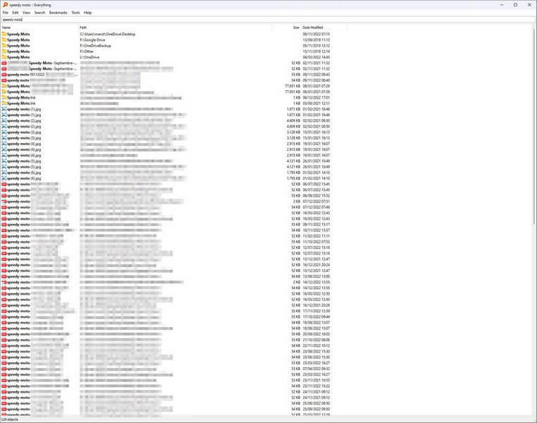 On my mobile phone, I subscribe to Google News, so while I’m waking up and drinking my morning tea, I browse through tech articles and the other day I came across an article praising the freeware, Everything from Voidtools. Described as lightning fast and bearing in mind my opinion of Windows Search, I just had to try it out. Using the same search parameter (ie, Speedy Moto), I hit enter and the results appeared in less than a second.