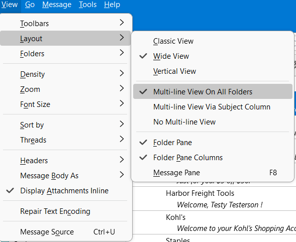 - Multi-line View, a view- similar to what Outlook offers. From the menu, the multi-line view is turned on by selecting View / Layout / Multi-line view on all folders