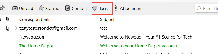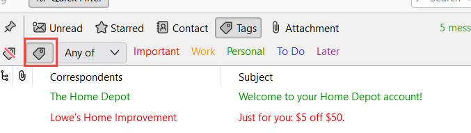 An additional tags toolbar will display. From this toolbar, messages to display with all tags, individual tags, or a combination of tags can be selected. As in Thunderbird, tagged messages can be selected: