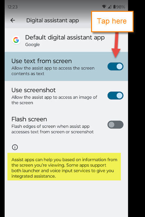 • Use text from screen (Allow the assist app to access the screen contents as text.)