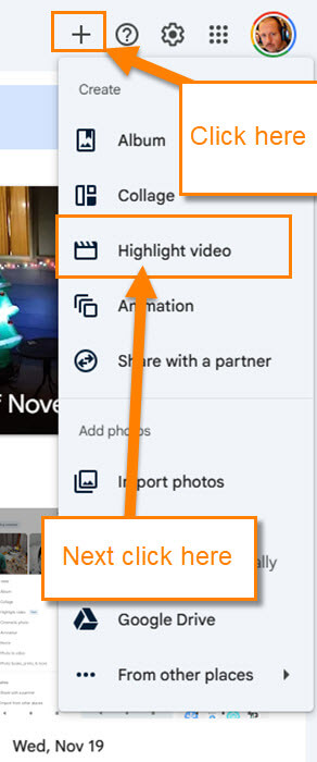 Step 4: Once on the Photos screen, look to the top right for the Plus sign. Click it, and a menu will appear. On the menu, click on Highlight video link.