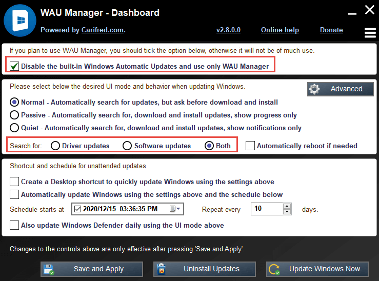 Most importantly, make sure to place a checkmark in the box next to “Disable the built-in Windows Automatic Updates and use only WAU Manager“. You can also choose whether to apply driver updates, software updates only, or both, as well as create a schedule for unattended updates.