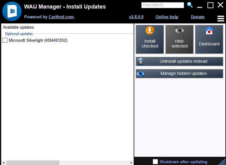 WAU Manager (Windows Automatic Updates Manager) is a fully featured replacement for the built in Windows Updating interface. This tool gives you full control of the Windows Updates, such as when and how they are installed, and has full uninstall and maintenance support for Windows updates ~ WAU Manager