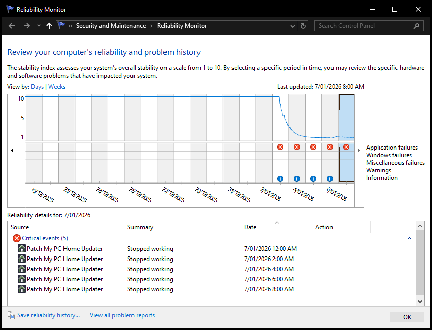 • Windows updates can cause instability issues. Reliability Monitor shows precisely when updates were installed, helping pinpoint a potential culprit