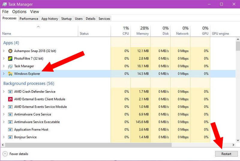1. I opened the Task Manager, clicked “Windows Explorer” in the task list, and then clicked “Restart” (in the lower-right corner).