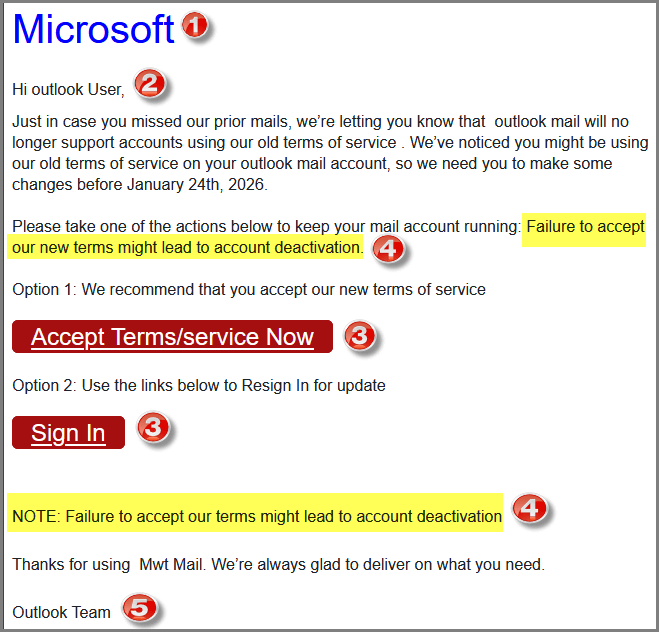 - Note the attempt to create a sense of urgency: “Failure to accept our new terms might lead to account deactivation“