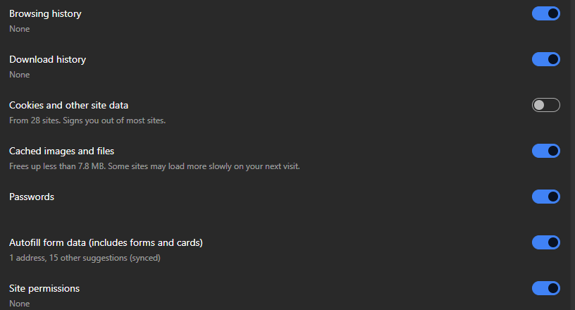 For optimum privacy I guess the user should disable the option to “Allow sites to save and read cookie data“. However, in my opinion, the inconvenience of needing to keep signing in to accounts at each visit outweighs any privacy concerns (see Clear Browsing Data > Cookies and other site data above)