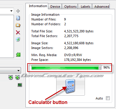 Click on the Calculator button to ensure that your movie will indeed fit onto a single layer disc. You will then see indicators of space required versus space available, per medium of a usage bar graph plus adjacent percentage: