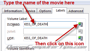 Now click on the Labels tab and type the name of movie into the dialogue box labeled ISO9660:. Copy the identical label into the UDF field by clicking on the icon (as identified by the red arrow):