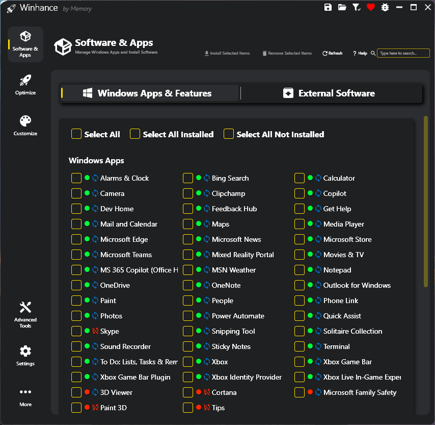 Down the left-hand side, we have Software & Apps (the default view), Optimize, and Customize. Clicking Optimize and/or Customize brings up related Windows settings that you can adjust from within Winhance. Many of the optimization settings are already set to optimum within Winhance, with associated recommendations and tool tips.