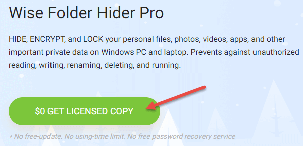 This includes perpetual use (no time limit) for the current version only, no free future updates. It also does not include a password recovery service so you’ll need to make sure you do not forget or lose the password you use to hide your folders. Or you’ll be in deep doo-doo.
