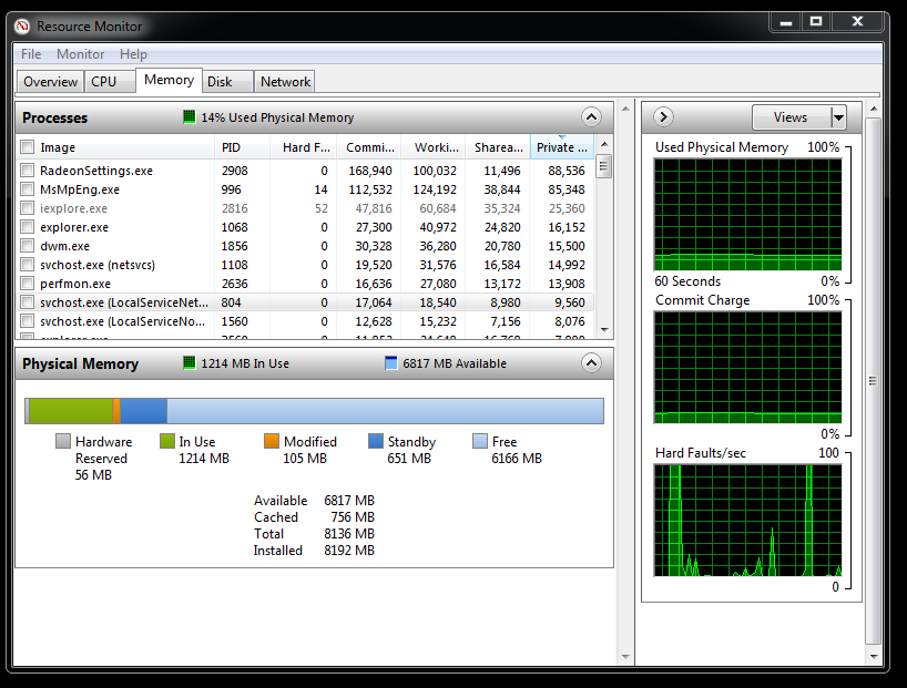 This is a screenshot of my W7 Resource Monitor with the memory tab ticked. As you can see I am only using a little over 1.2MB of ram.