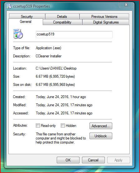 As you can see this is the ccsetup519.exe, and I am sure everyone has installed CCleaner, at one time. This was happening for all installers that i was trying to run. Pay attention to security and the unblock tab by opening the properties of the ccsetup519.