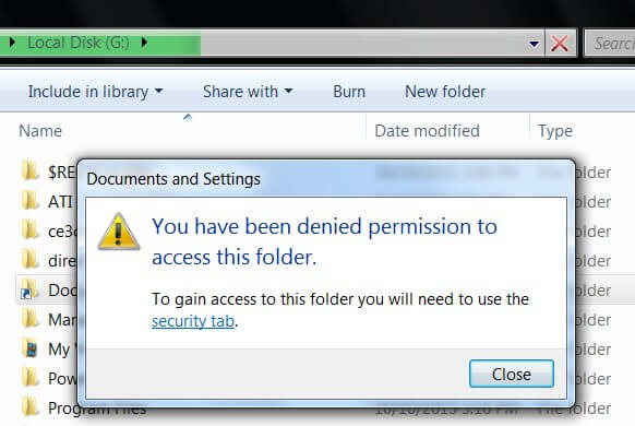 I hooked up my old XP hardrive to an external enclosure and most of the files and folders opened without any problems but when I tried to open some like "Documents and Settings" I got a pop up window that said "You have been denied permission to access this file".