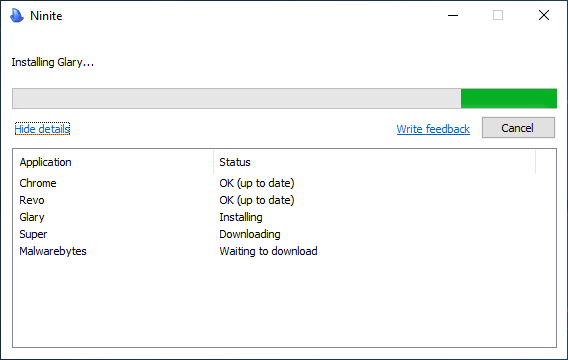 You check the ones you want– the ones I picked here are Chrome, Malwarebytes, SUPERAntiSpyware, Revo, and Glary. With the exception of CCleaner, they are the programs I use to maintain my computer. Ninite does not download any of the programs you have checked. It downloads a tiny installer program to your computer which contains a list of the programs you checked.