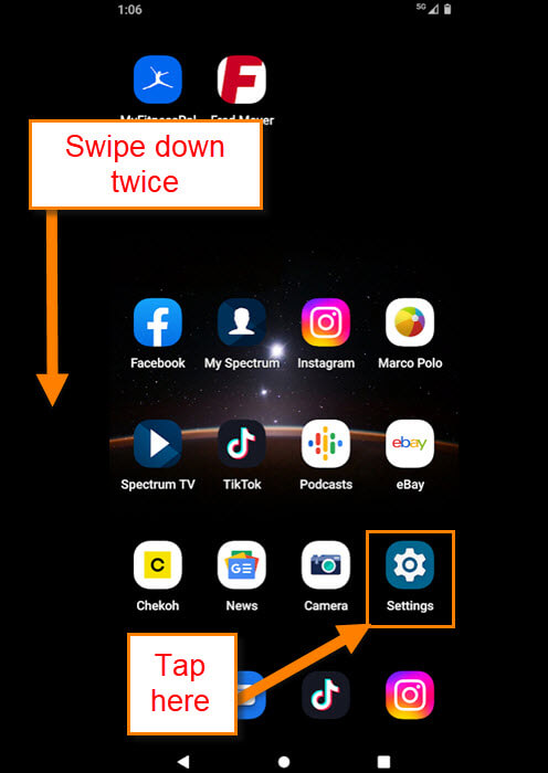Step 1: Look for the Settings (Gear) icon which you can see on the front of your phone in the picture below. If you don’t see the Settings icon here, Swipe down from the top of your screen twice.