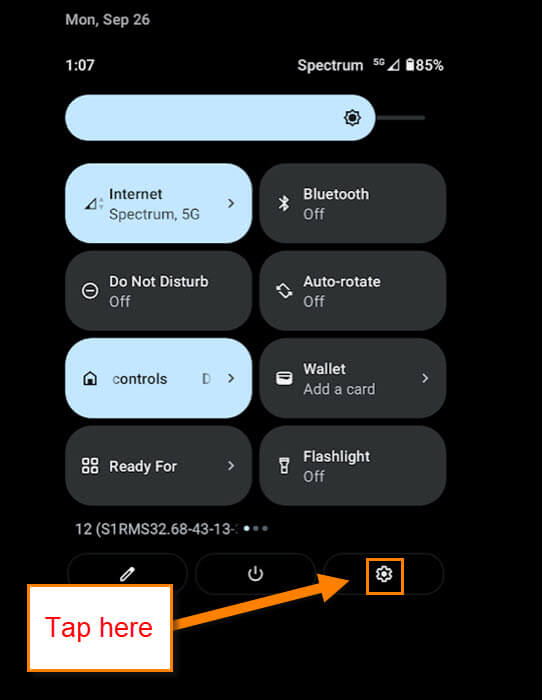 Step 1: You will need to swipe down only once from the top of the phone. Tap on the gear icon.