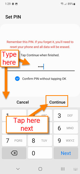 Step 5: As on the other device, you will be asked to key in your current PIN to move on. After that, you will be on the Set PIN screen. Type in a new PIN and then tap Continue.