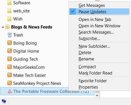 I use the Thunderbird email program and this morning I noticed two unusual marks in my newsfeed accounts. In front of the account name was a pink triangle with an exclamation point inside it. I right-clicked on one account listed and I noticed on the top of the menu that the Pause Updates was checked.
