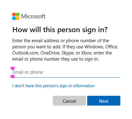 After creating your Microsoft Administrative Account, sign in. You may create a standard account for daily activities. Click on “I don’t have this person’s sign-in information.”